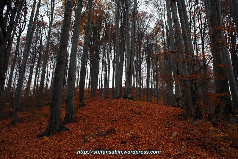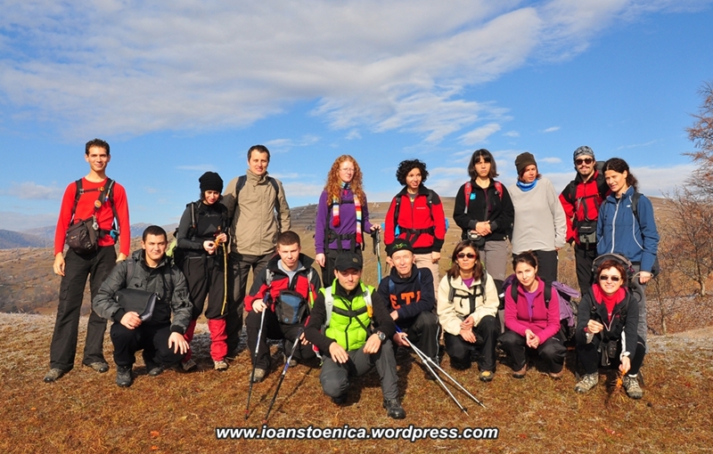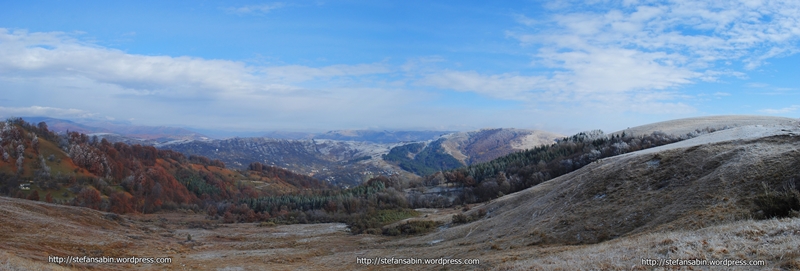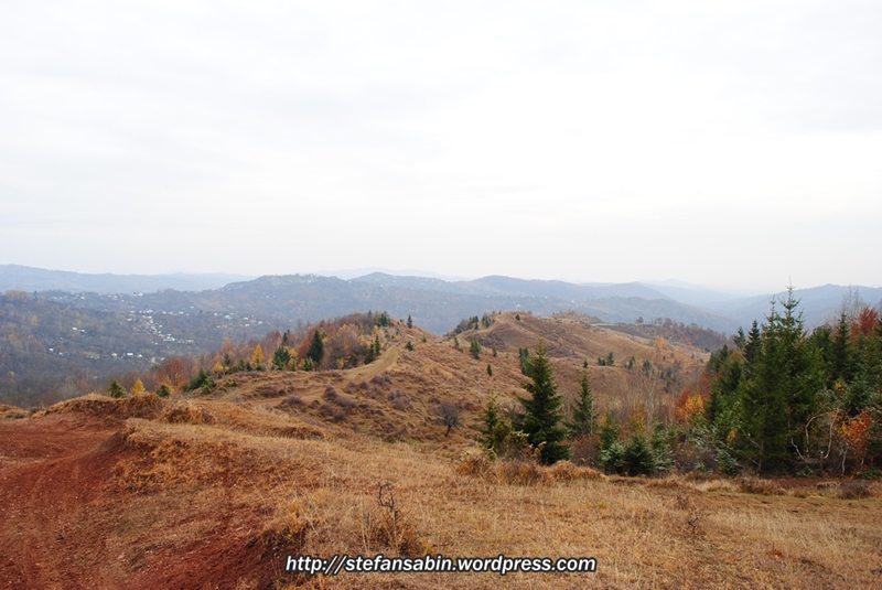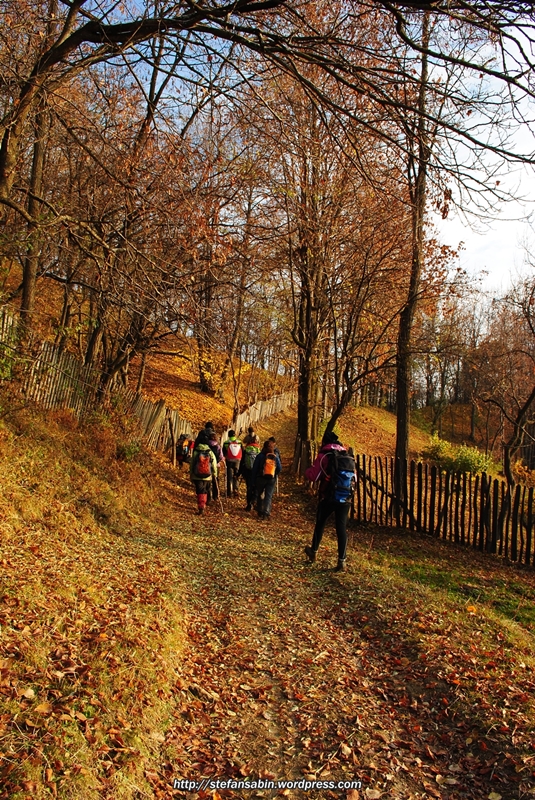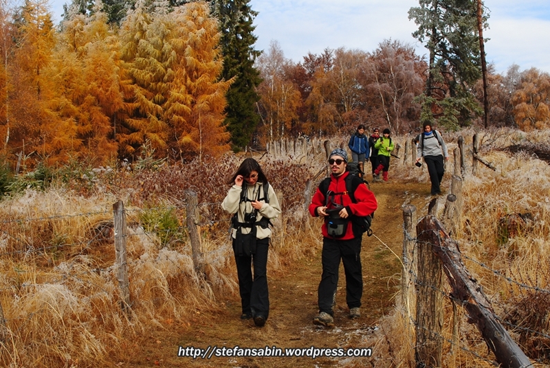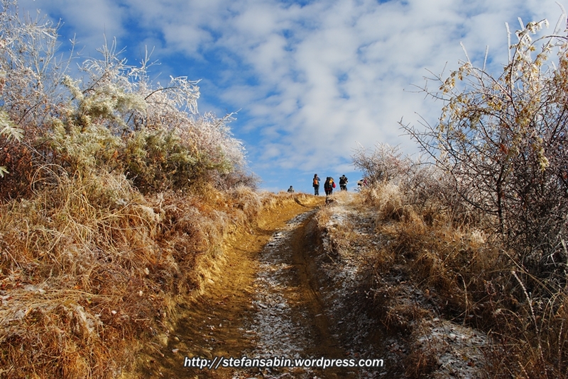 Iesim din oras si urcam pe un drum acoperit de frunze si putin noroios. Casele se risipesc treptat si in locul lor apar in curand delicatesele toamnei tarzii: macese si paducel. O pojghita subtire de gheata le acopera, facandu-le parca mai proaspete si apetisante. Iarba uscata zace si ea sub un strat de chiciura, dovada a luptei aprige dintre iarna si toamna. Cea din urma se resimte dupa noaptea ce-a trecut insa asteapta plina de speranta represalii din partea principalului ei aliat, soarele. Noi asistam plini de admiratie la lupta celor doua si ne croim drum pe frontul lor de lupta. Ajungem pe un varf de deal si ne oprim pentru o pauza de masa, apoi continuam prin aceleasi decoruri de poveste.