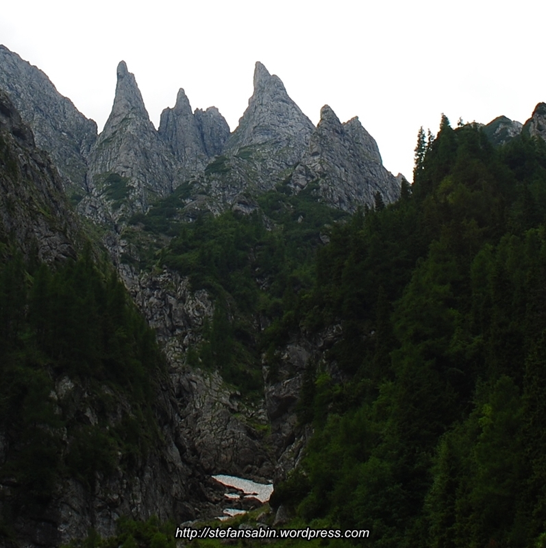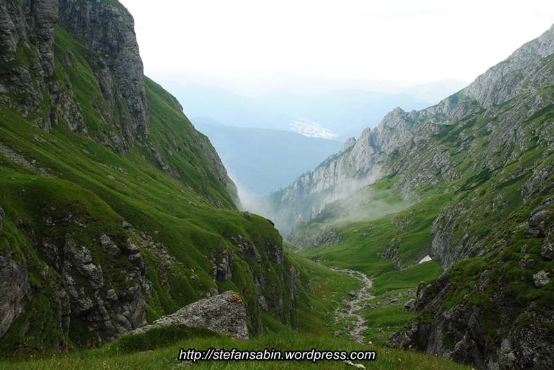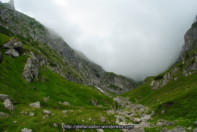 Cativa stropi timizi de ploaie incearca sa ne sperie, insa nu au deloc succes, asa ca in scurt timp renunta. Noi continuam sa urcam tot intrebandu-ne unde este caldarea aia pe care o tot anticipam. Curand observam ca valea se desparte in doua fire: cel din dreapta , destul de neprietenos ar fi trebuit sa iasa dupa calculele noastre undeva pe langa varful Bucsoiu, iar cel din stanga in caldarea de sub varful Omu. Urmam bineinteles firul din stanga si dupa un urcus putin mai abrupt ajungem intr-un punct minunat de belvedere asupra intregii vai.