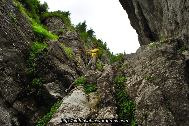 Urmatoarea saritoare ar fi fost destul de dificila daca nu era un copac prabusit pe care ne-am putut catara. Curand ajungem si la saritoarea pe care amandoi am votat-o ca fiind cea mai dificila de pe Valea Morarului. Foarte inalta nu este, insa nu are prize prea bune si mi s-a parut destul de greu de catarat. In acest punct folosim cordelina pentru bagaje, intrucat cu rucsacul poate am fi trecut dar gentile foto ne incurca rau.