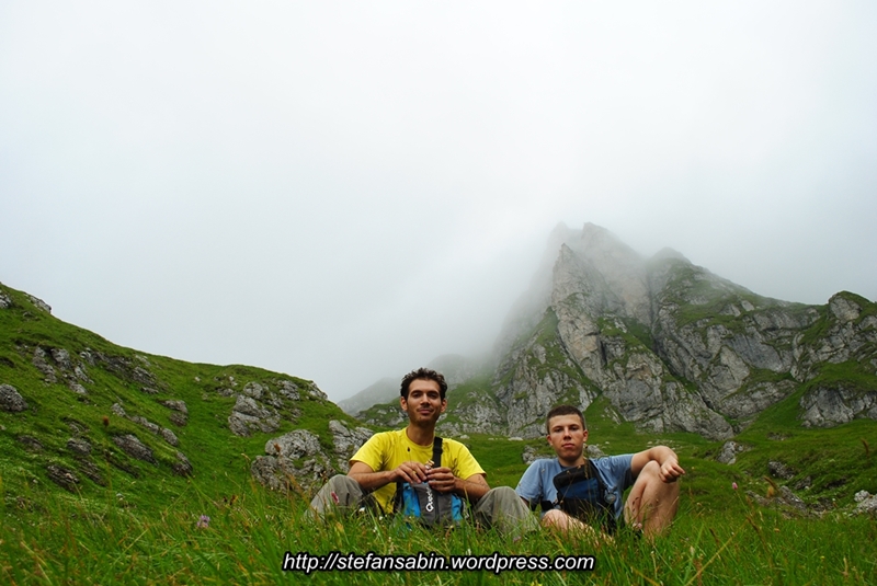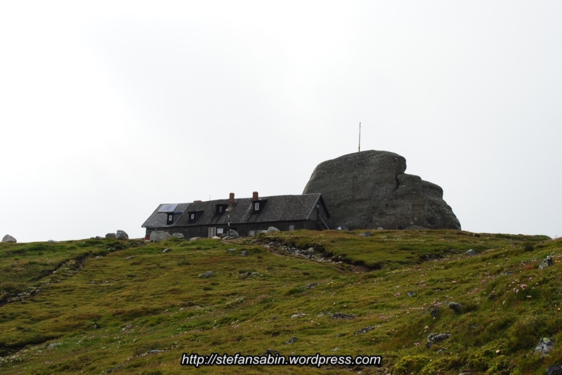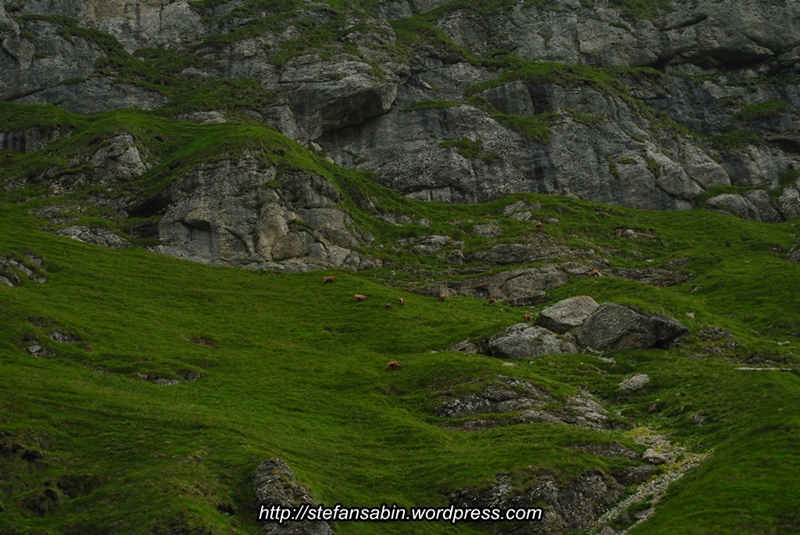 Pe masura ce castigam altitudine ne intampina o ceata umeda pe care o anticipasem inca de la poale. Pe fetele acoperite de iarba vedem si primele capre negre din aceasta excursie, destul de multe si deloc sfioase, prin urmare ne bucuram de prezenta lor multa vreme.