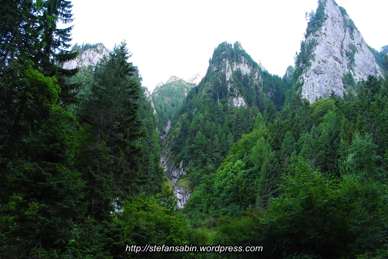 Daca pe firul vaii nu vedeam prea multe in jurul nostru acum peisajul s-a mai deschis si peretii impunatori de stanca ai crestelor Morarului(stanga) si Balaurului(dreapta) ne dau senzatia ca ne aflam intr-adevar in inima muntelui.